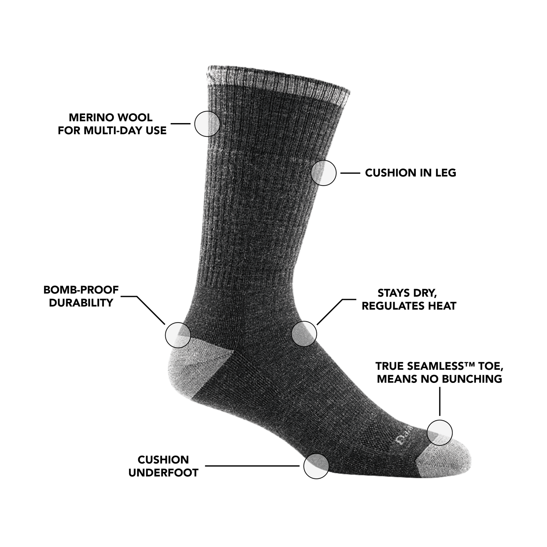 - Merino Wool is a hard-working fiber that moves moisture away from feet, keeping them fresh and dry.